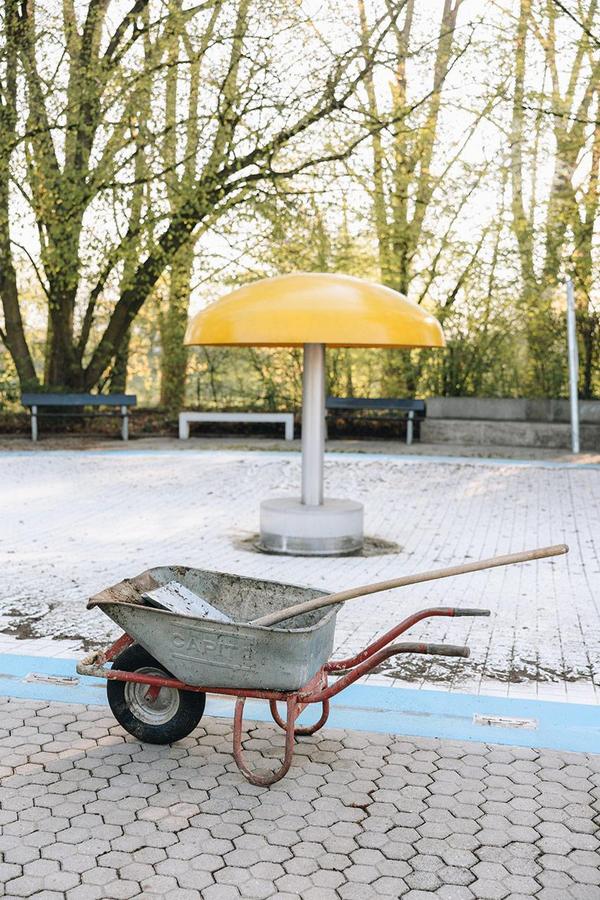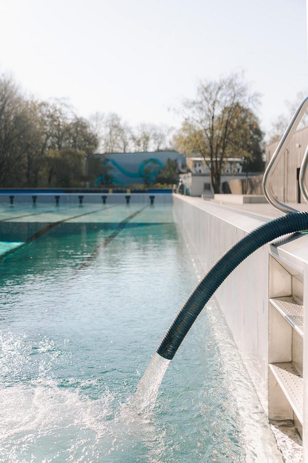 Als erstes machten sich die Freibad-Teams an die Reinigung der Terrassen-Bereiche und der Beckenumgänge. Dann wurden die Außenbecken geleert und gesäubert. Denn um die Becken in Form zu halten und Beschädigungen zu vermeiden, bleibt über den Winter ein Teil des Wassers darin. Mit großen C-Schläuchen füllt das Team die Becken. Insgesamt laufen im Westbad drei Millionen Liter Wasser durch die Schläuche, um das Springerbecken, das Spaßbecken und das Kinderbecken neu zu füllen. Das sind rund 20.000 Badewannenfüllungen. Bis das Spaßbecken komplett voll ist, vergehen circa zwei Tage – beim Springerbecken bis zu vier Tage.